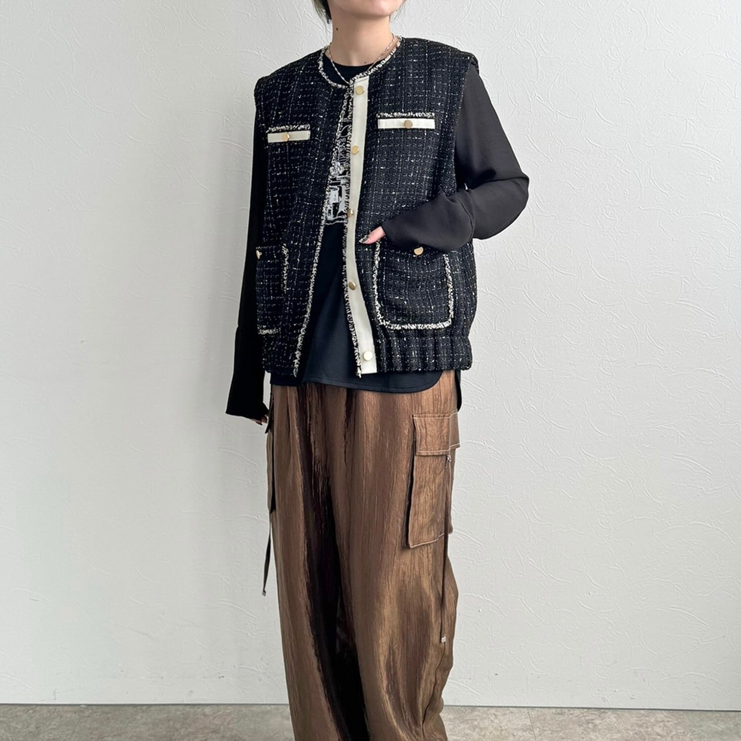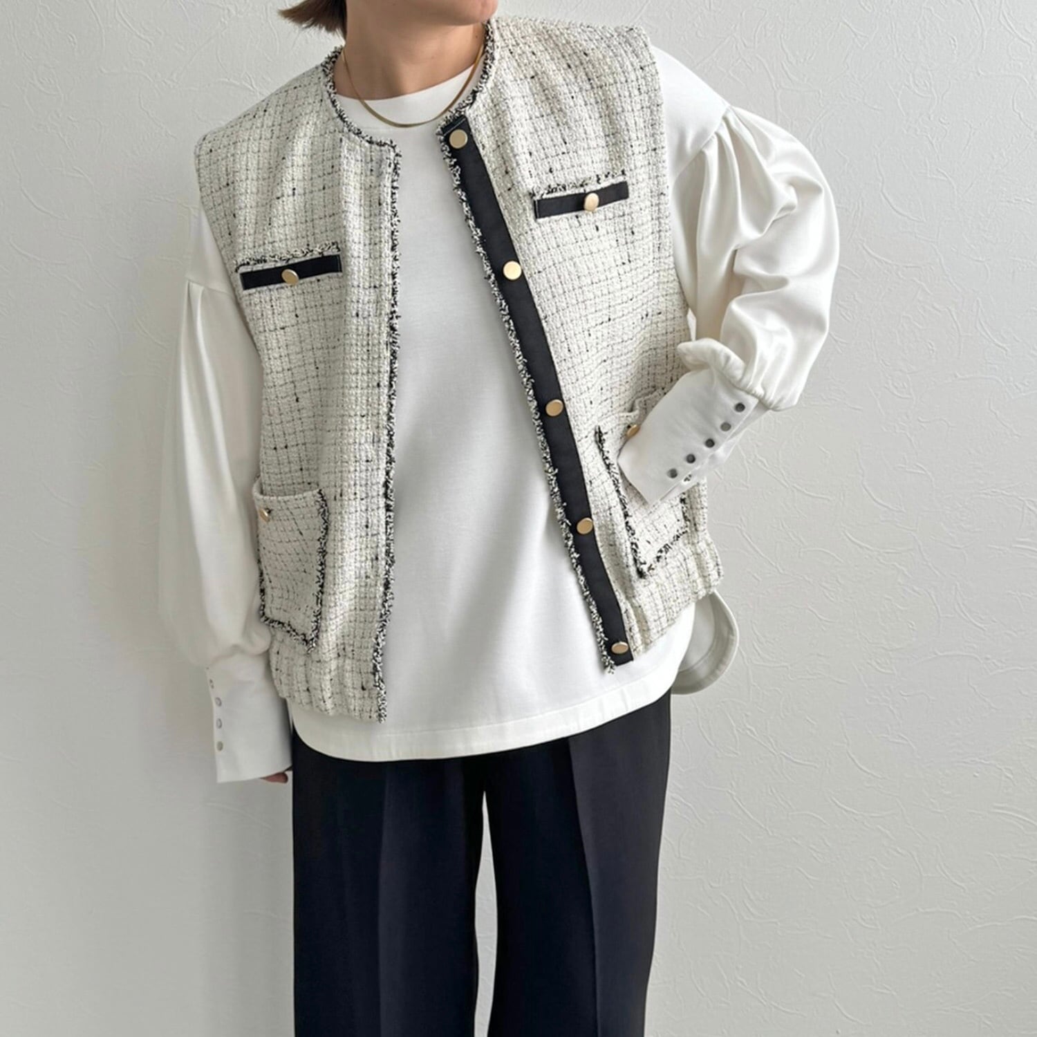 ツイードを贅沢に使用したトレンド感あふれるベスト。