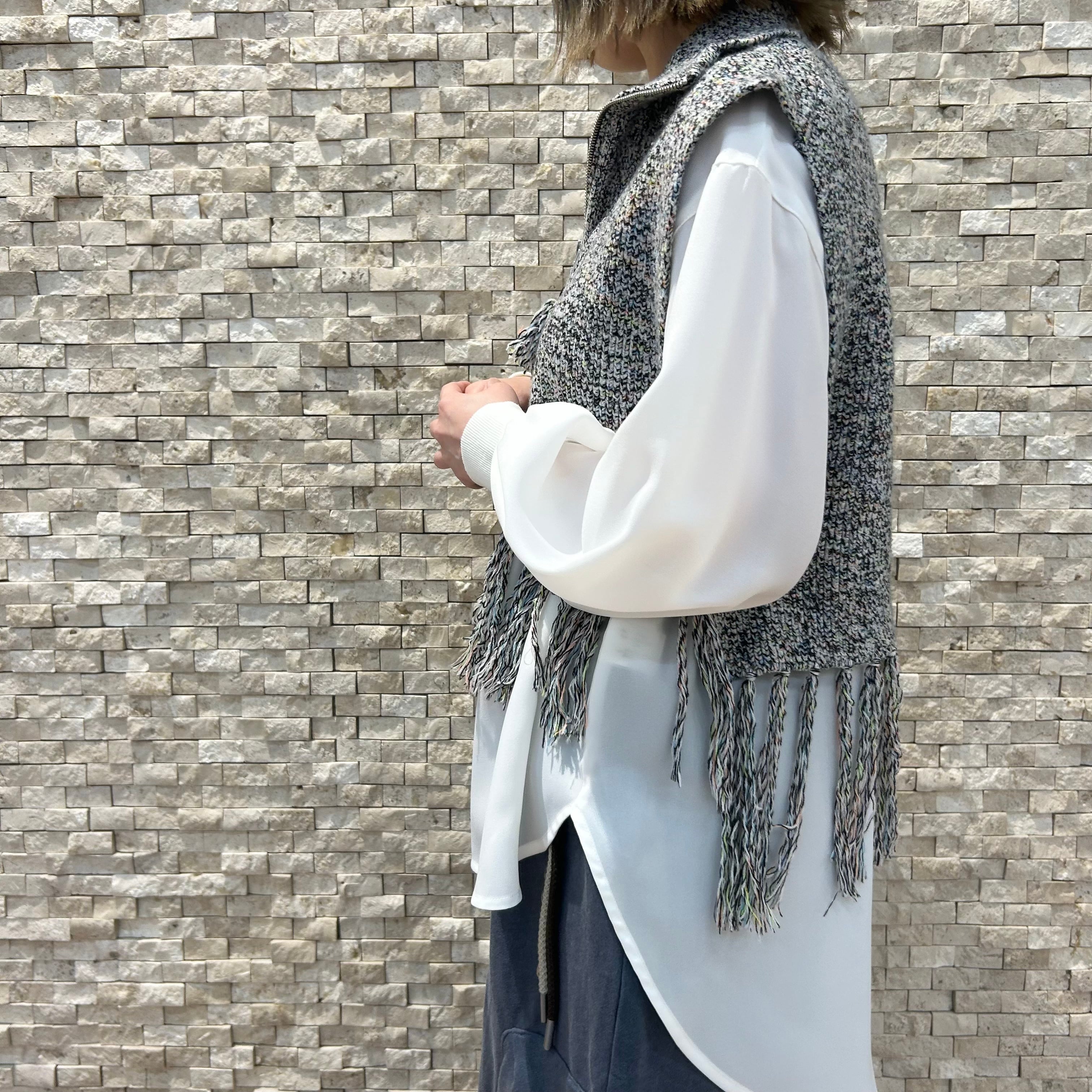 カラーネップがアクセントのZIP-UPフリンジベストです!トレンド感を楽しみながら、気軽に重ね着ができるアイテムとなっています。フリンジデザインがそのままポイントになり、シンプルコーデに遊び心をプラスしてくれます♪