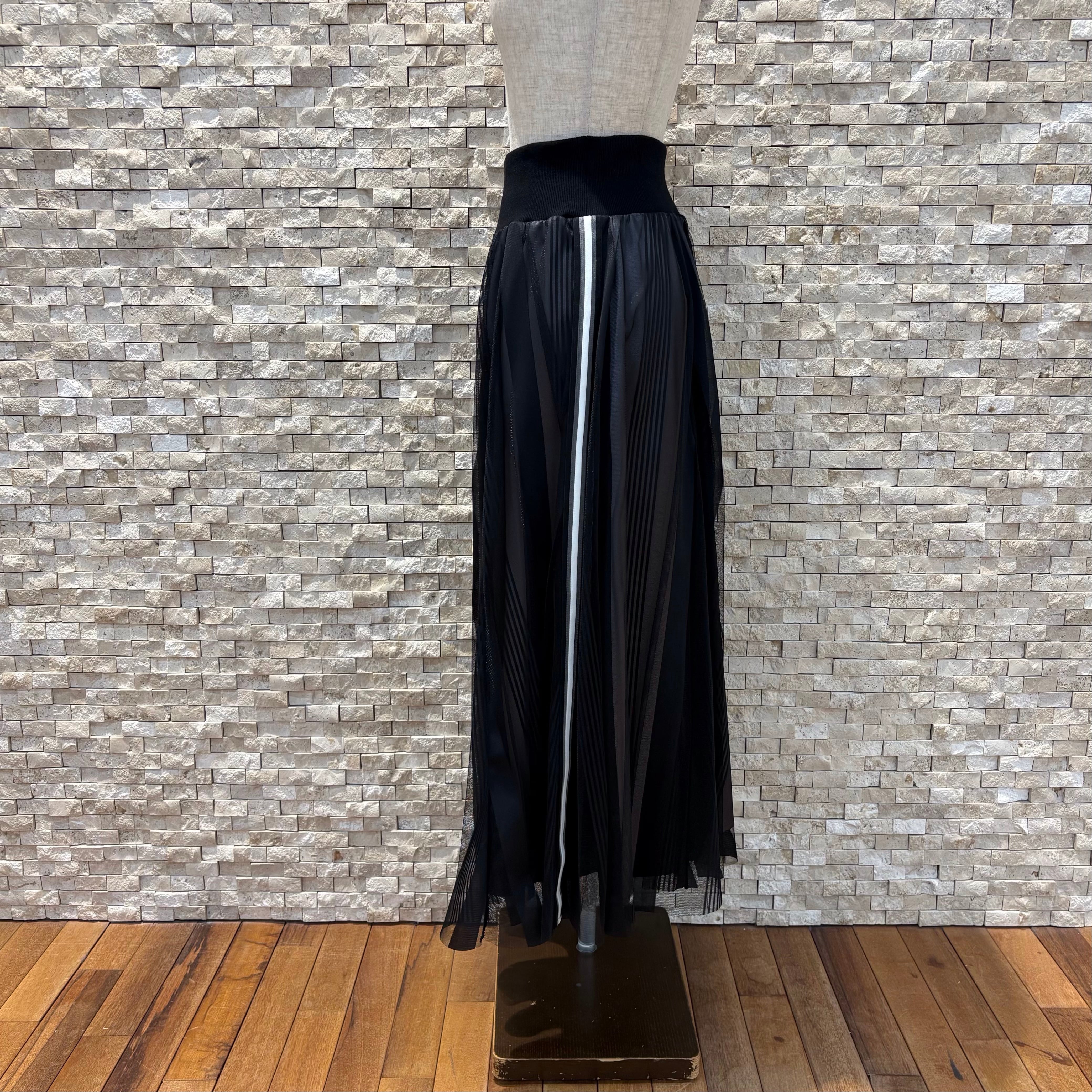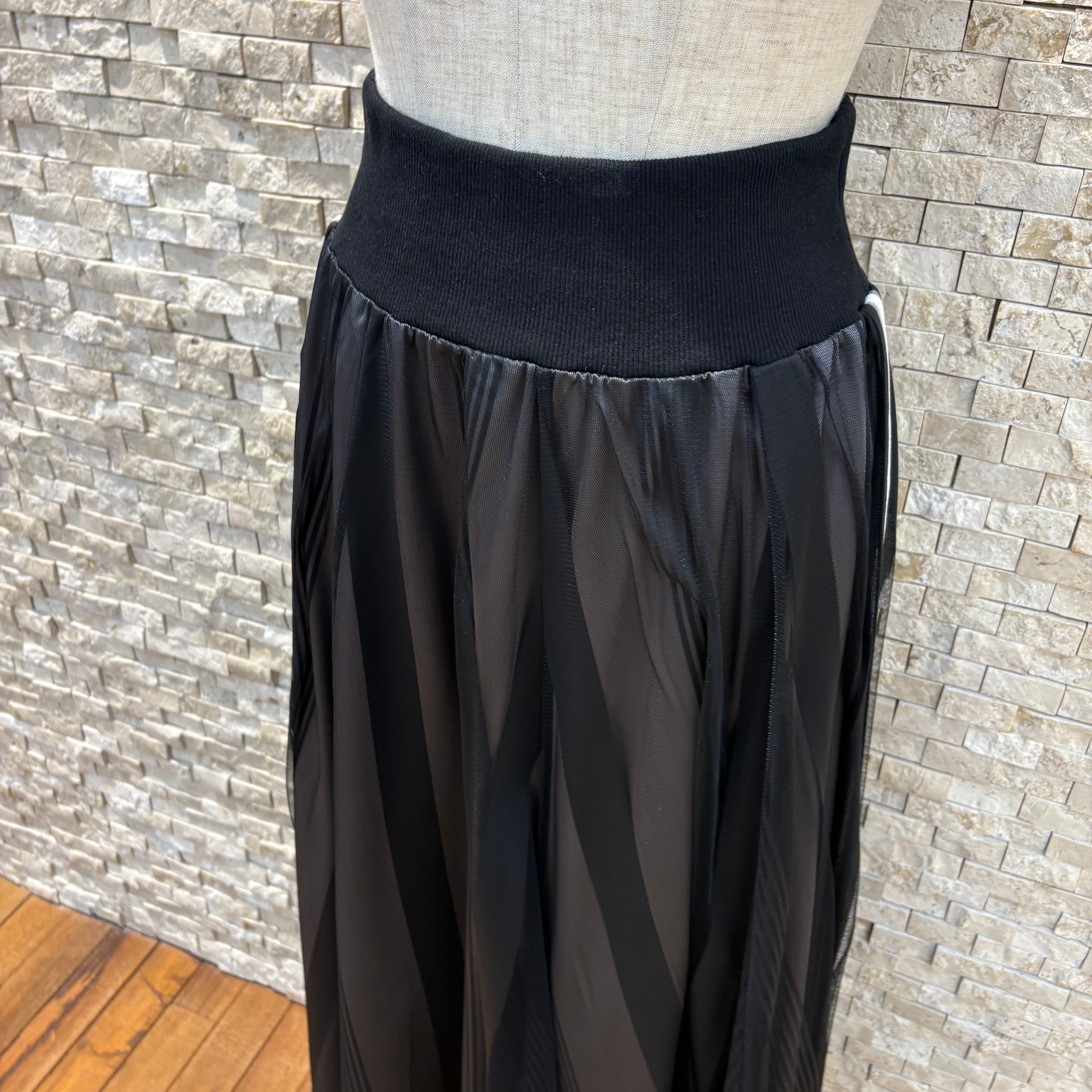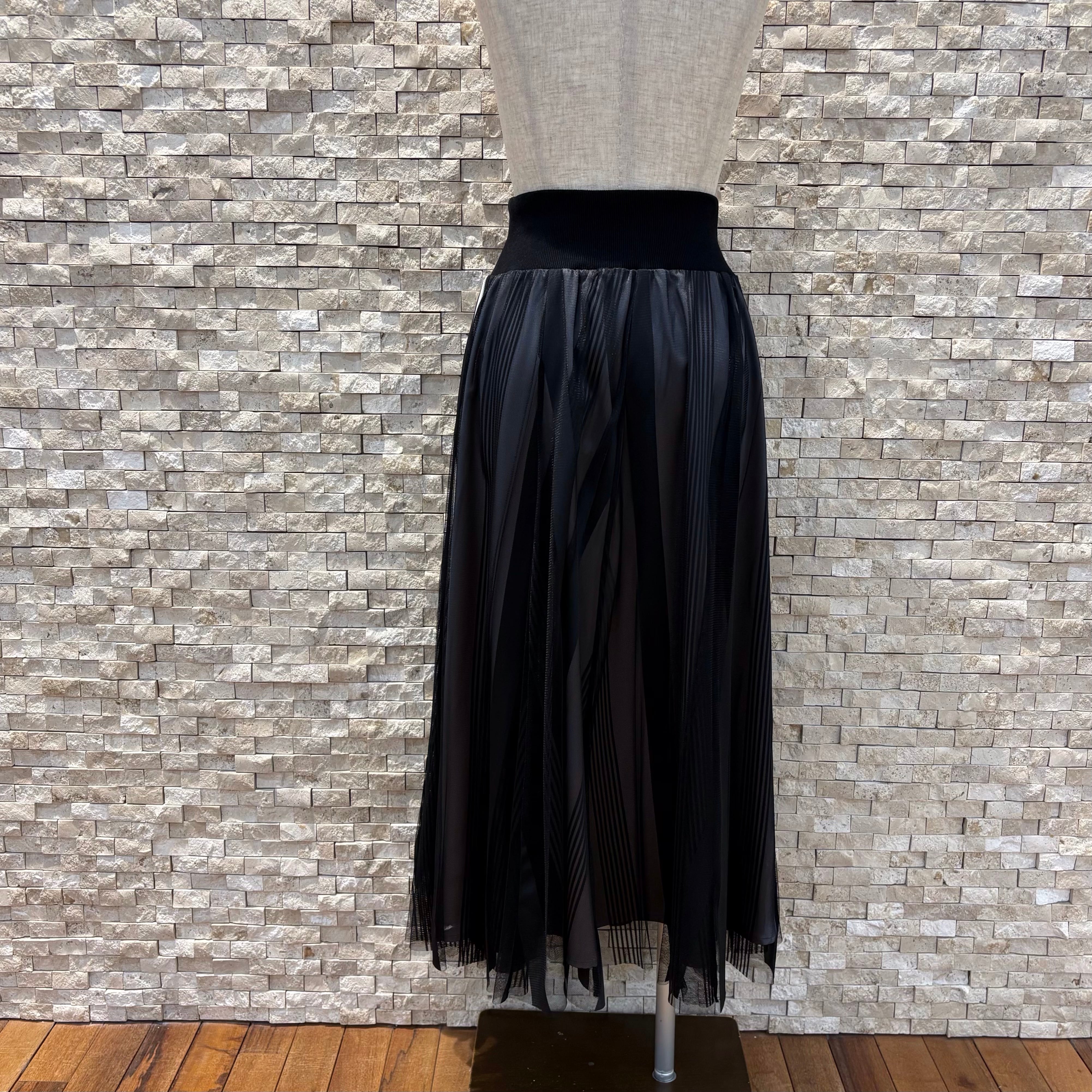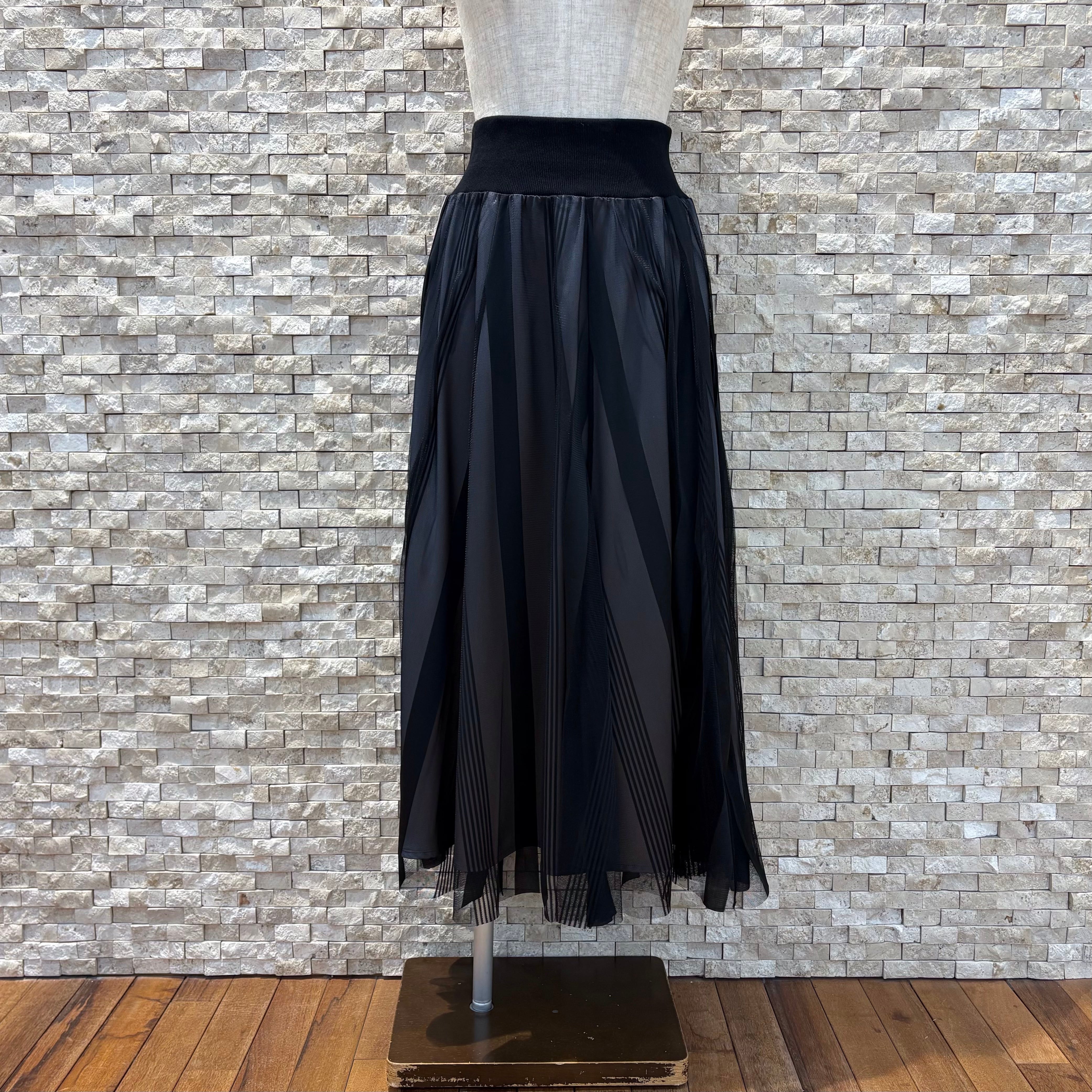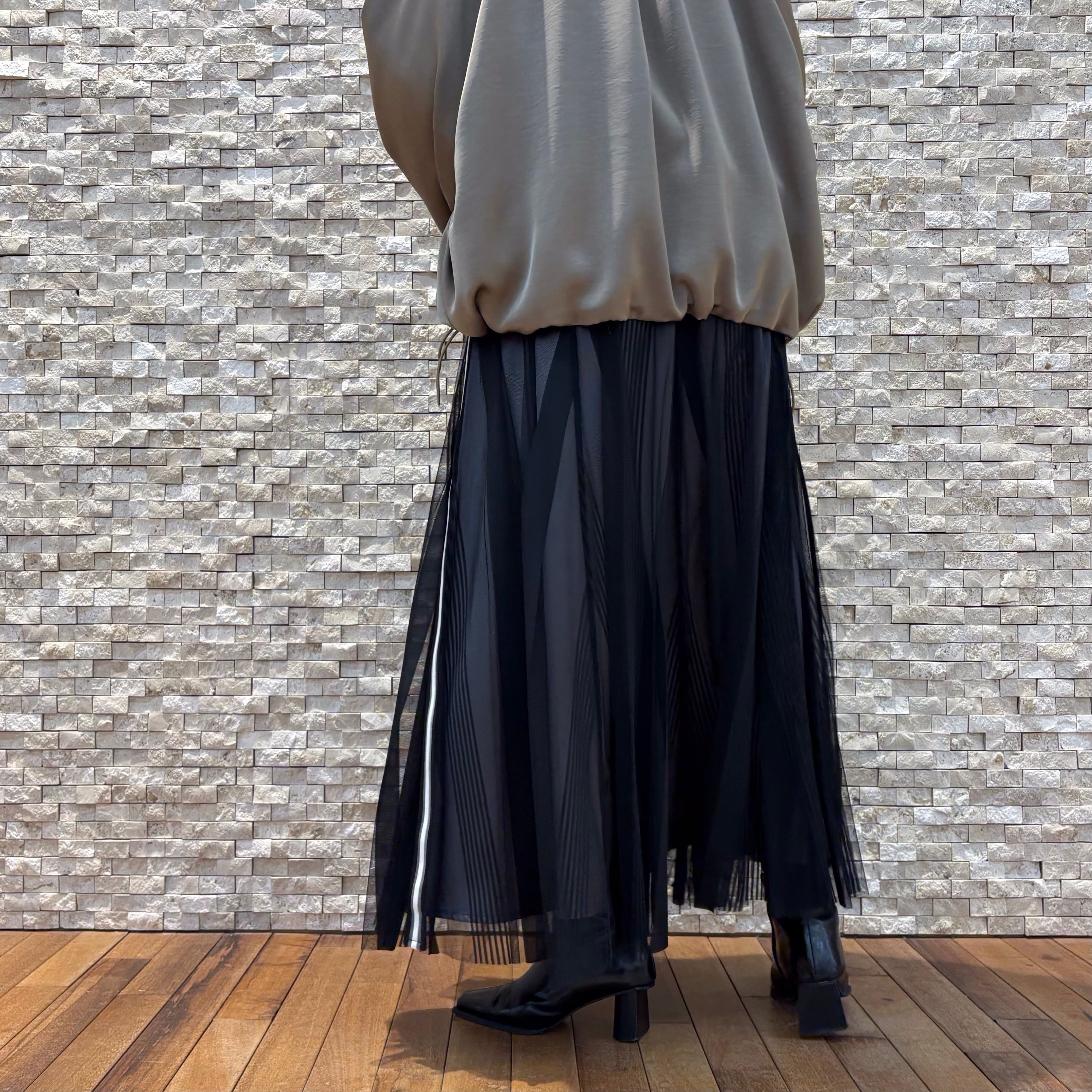 軽やかなチュール素材で動くたびに揺れるフレアーシルエットが女性らしいコーディネートに。ウエスト部分はリブ仕様で楽ちんですよ!